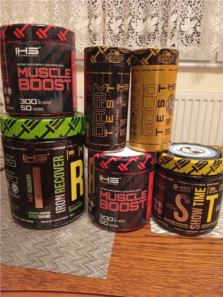 Suplementacja Show time w dni treningowe 2 porcje Iron Recovery po treningu Muszle Boots 3 porcje każdego dnia Darek Test -3 kap rano Gold Test - 3 kap rano