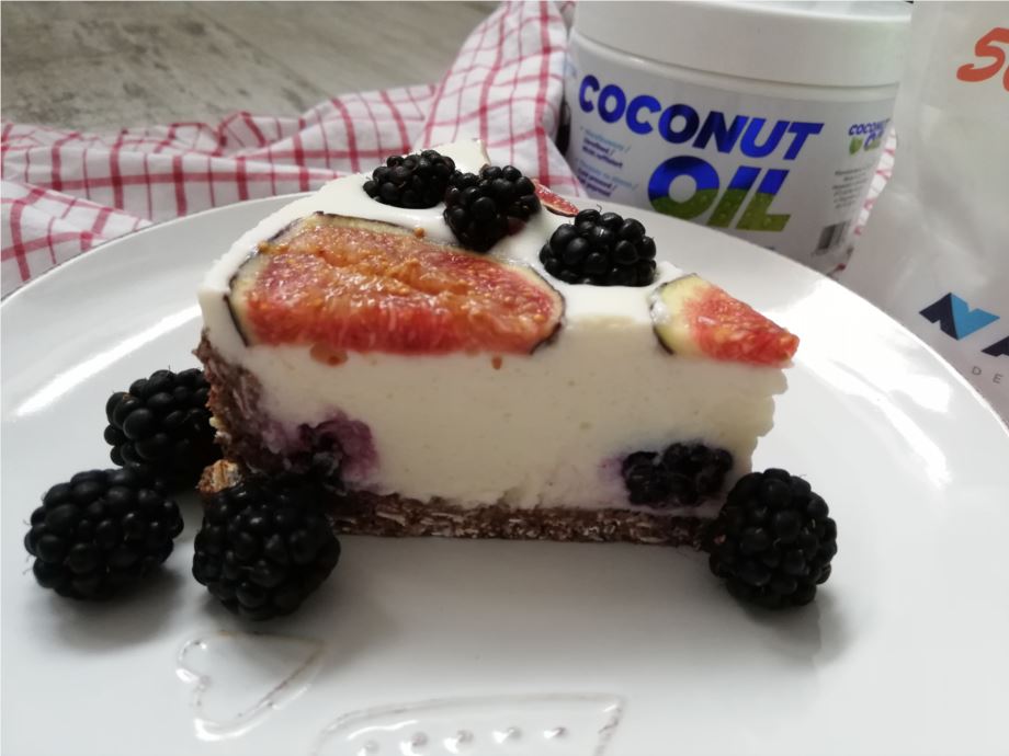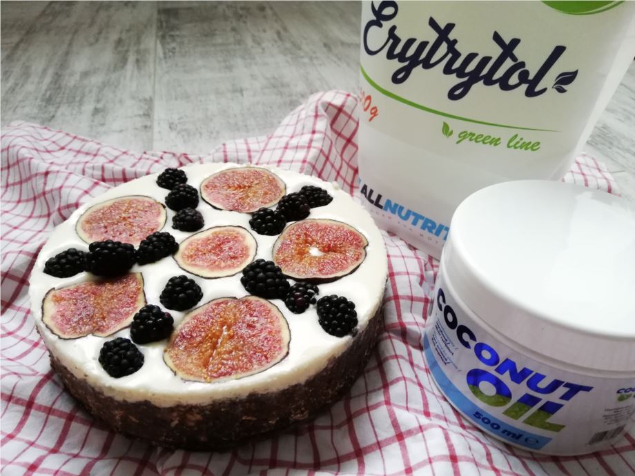 Serek wiejski blendujemy, dodajemy białko, etrytrytol i miksujemy około minuty. Żelatynę rozpuszczamy we wrzątku, studzimy, i dodajemy do masy serowej. Blendujemy ponownie około minuty. Na spodzie ciasta układamy jeżyny - możecie spokojnie zamienić na inne owoce jagodowe i zalewamy masą serową. Na górze układamy pozostałe owoce. Ponieważ sezon na figi i jeżyny jest krótki - wykorzystuje te owoce gdzie tylko mogę:) Całość chłodzimy około godziny. Gotowe.
