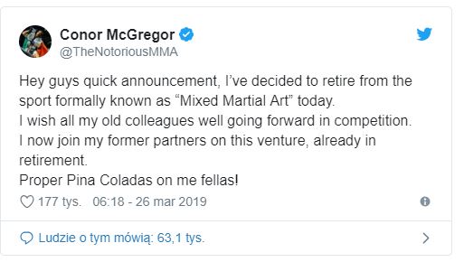 "Hej ludzie, krótkie ogłoszenie. Zdecydowałem się wycofać ze sportu oficjalnie nazywanym “Mieszane sztuki walki”. Życzę wszystkim moim kolegom z branży powodzenia w dalszej rywalizacji. Teraz dołączę do moich byłych partnerów w tym sporcie, już na emeryturze. Polejcie Pina Colade na mój koszt!" - napisał na Twitterze McGregor.