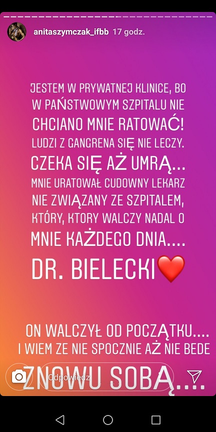Zawodniczka bikini fitness Anita Szymczak nagrała przejmującą relację na Instagramie. Od sześciu tygodni przebywa w szpitalu przykuta do łóżka. Jest to dla niej niezwykle trudne, ponieważ Anita jest wulkanem energii. Dzielnie znosi cierpienie, narkozy i zmiany opatrunku. Co się stało? Do jej organizmu wdarło się ciężkie zakażenie. Zgorzel gazowa czyli gangrena. Tylko dzięki temu, że trafiła do prywatnej kliniki udało się uratować jej nogi… i życie.